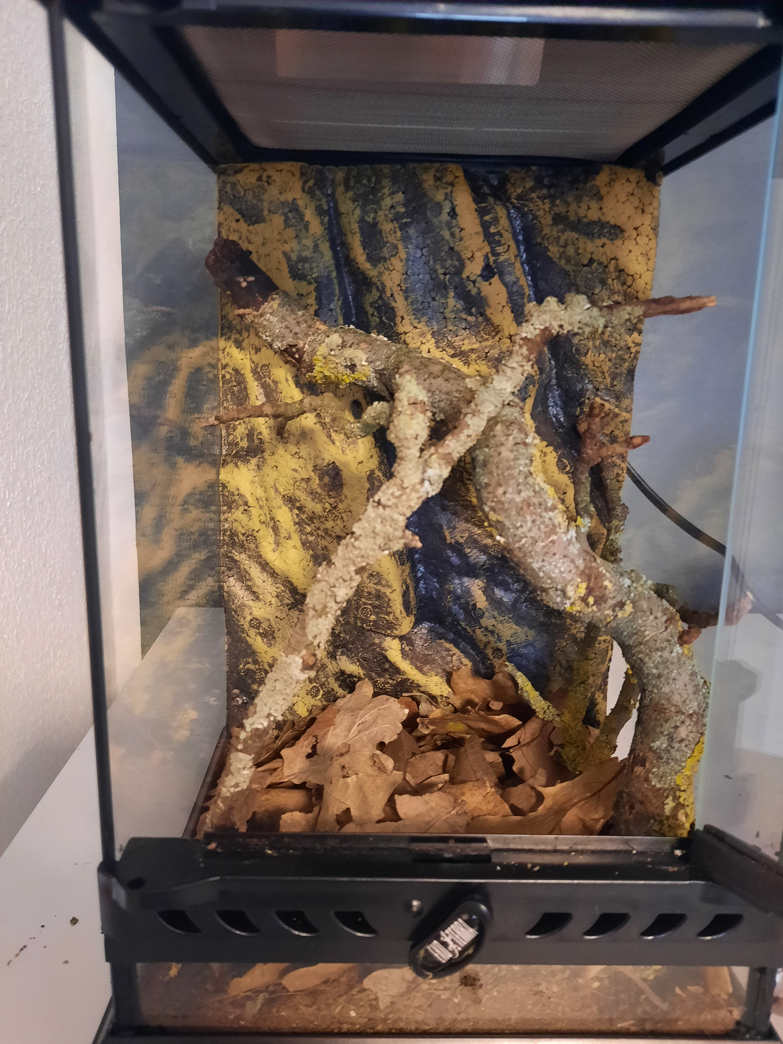 Vielleicht noch was dazu, um zu verhindern, dass dein Tier sich an den Augen verletzt (durch Reibung an der Scheibe) solltest du darauf achten, dass entweder die Futtertiere keine direkte Sicht zur Mantide haben oder die Scheiben mit Hängepflanzen etwas bedecken.